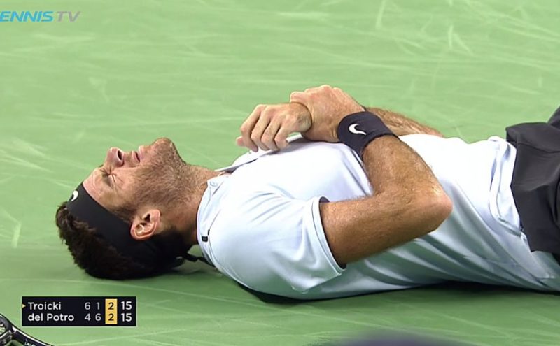 Juan Martin del Potro lying on the court, grimacing in pain, grabbing his wrist.