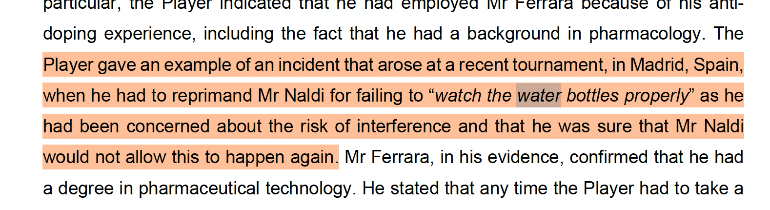 2) Why was physio Giacomo Naldi still employed when, as Sinner testified during the hearing, there had already been a situation in which it was clear Naldi was sloppy? It involved water bottles and lack of supervision. The anecdote buttressed Sinner’s argument that he had always been careful to a fanatical degree about anti-doping. But it mostly shows that there were priors with Naldi. So in a sense, it doesn’t help Sinner’s argument in that regard.
