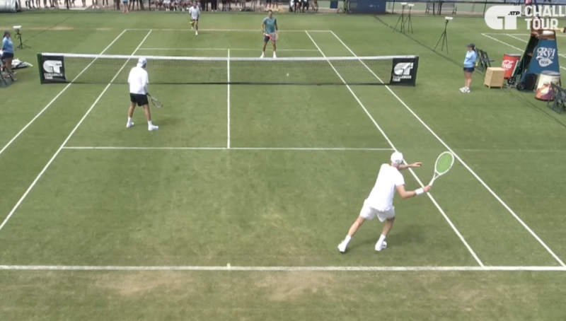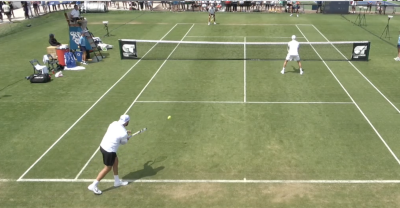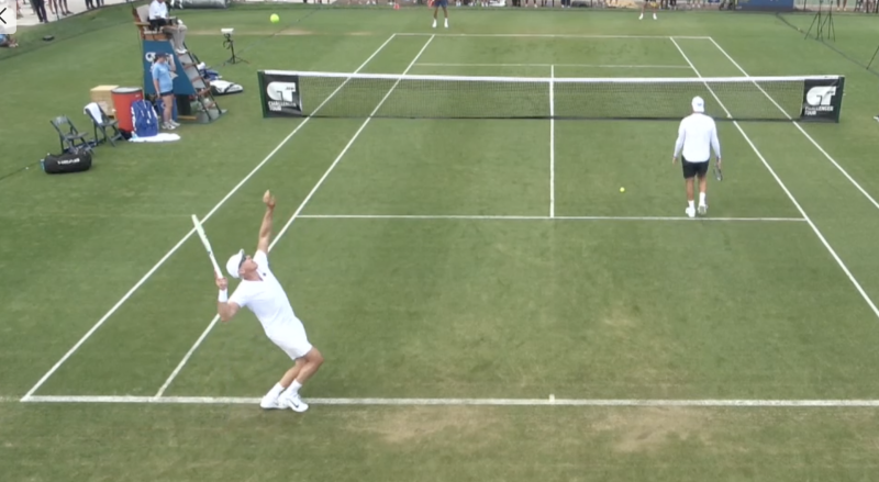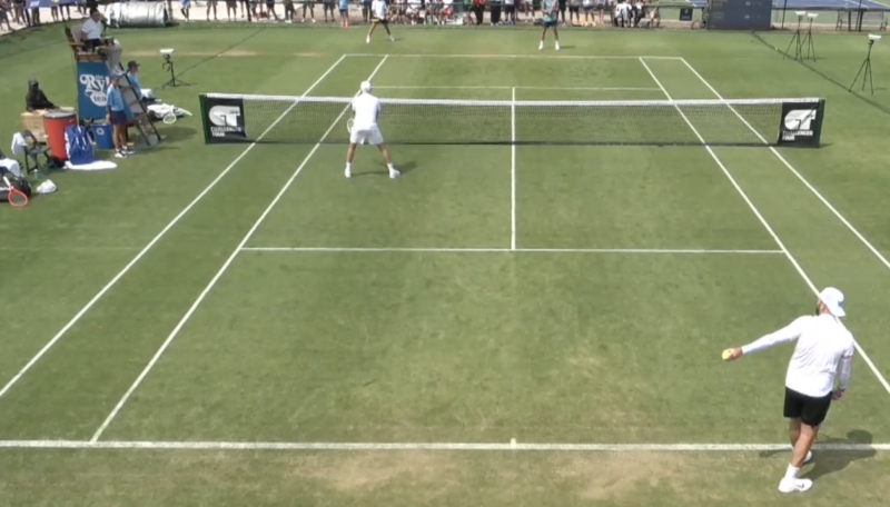 Warmup: Ackman warming up with Bernard Tomic, and having trouble with bouncing the ball on the court because of the lush grass. He’s having to awkwardly fetch them after they go awry.