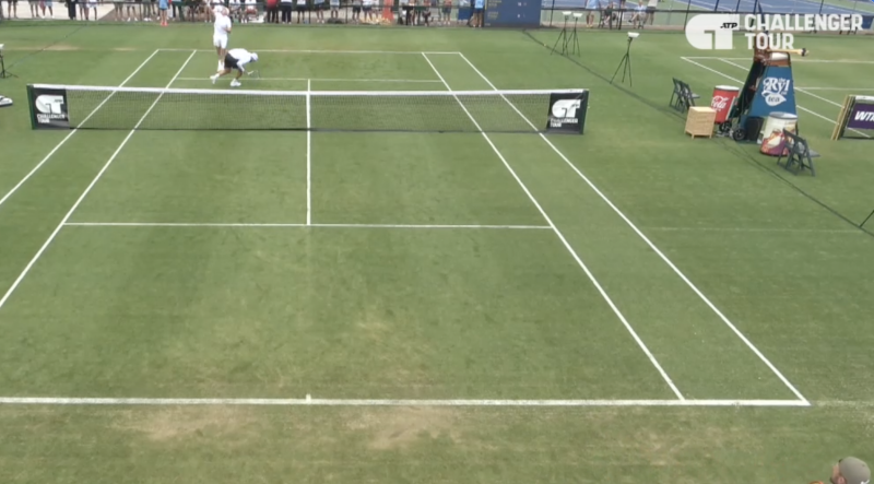 But oops, the racquet falls right out of Ackman’s hand after that. He has to bend down to fetch it. Awkward.