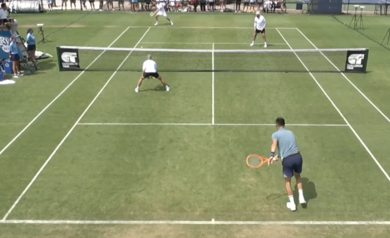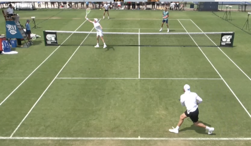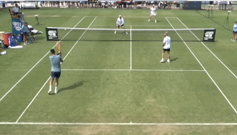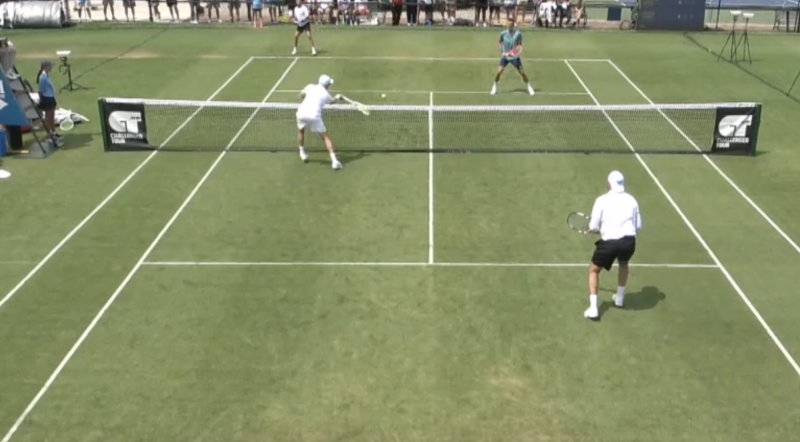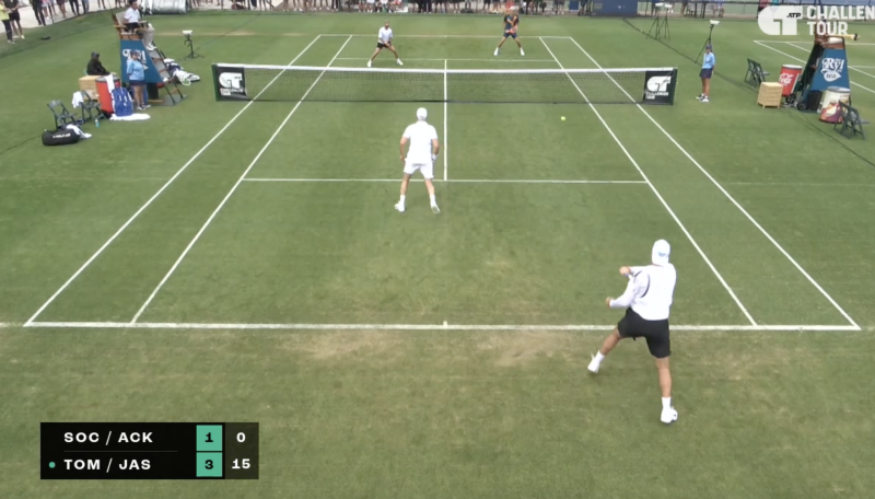 0-15 – Ackman thinks he has the winning volley down the middle. But NO! Tomic gets it back. And Sock airmails the smash.