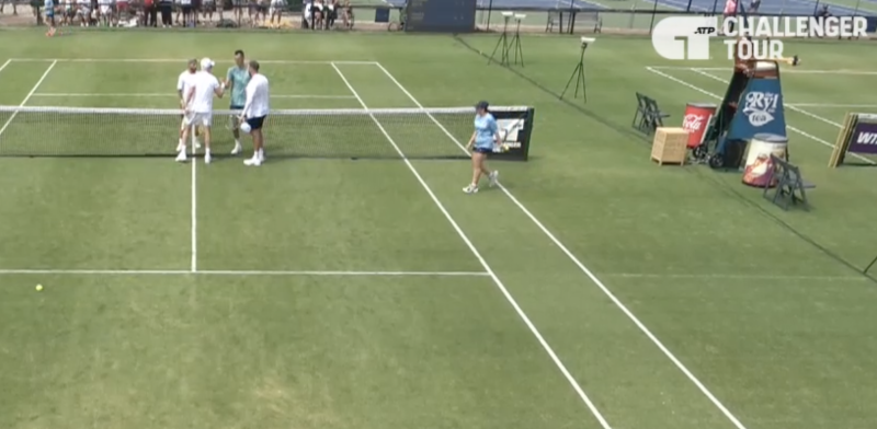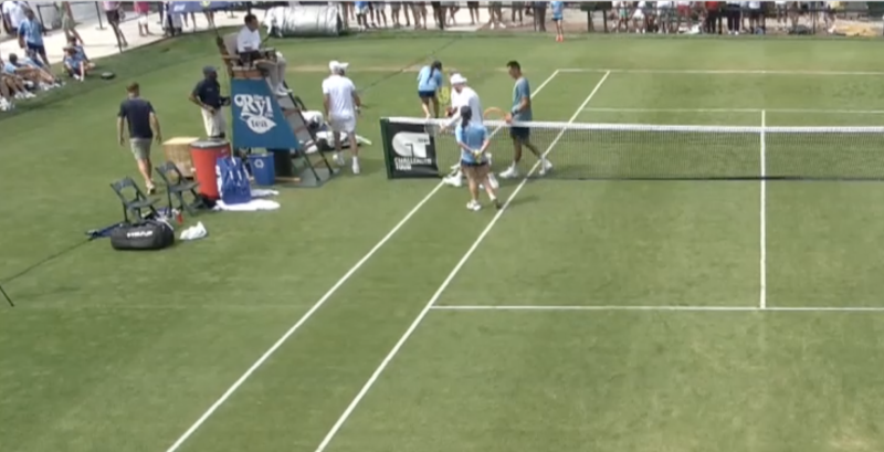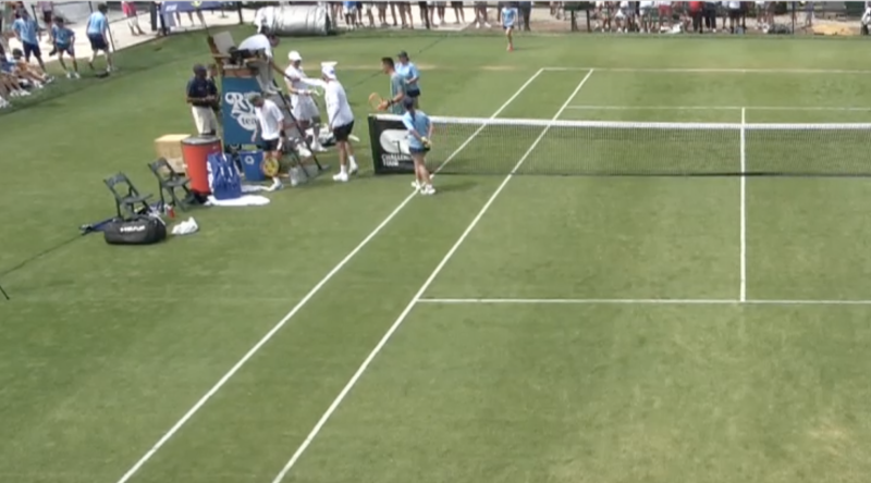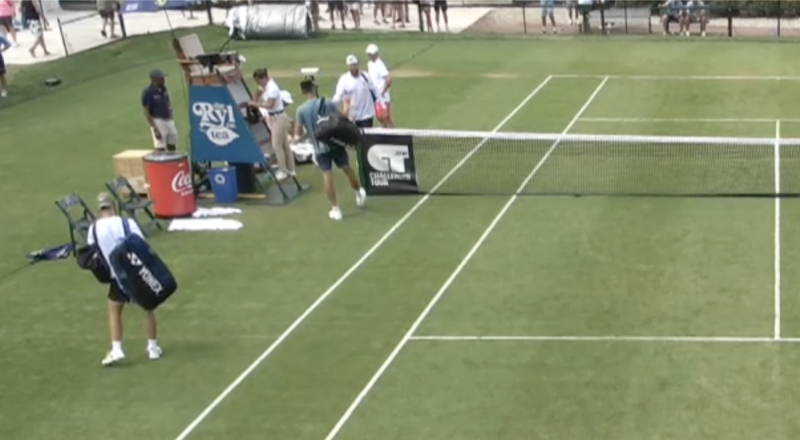 As the other players head to the chair umpire for the handshake, Ackman goes straight to his chair and gives the chair umpire a drive-by.