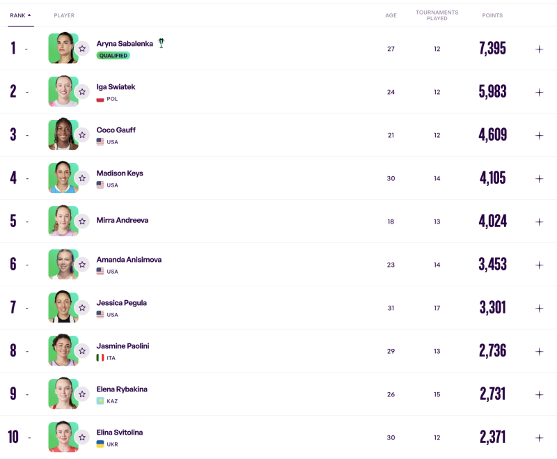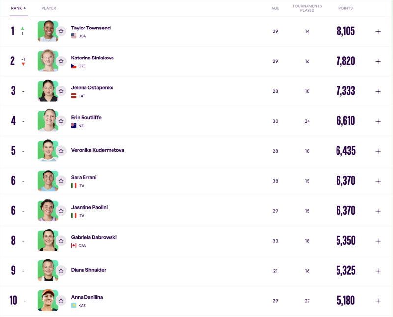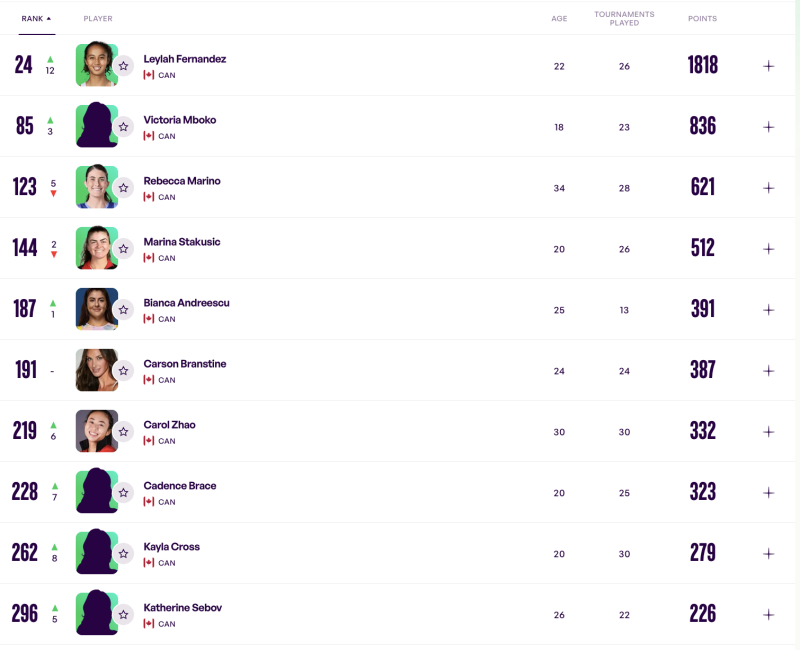 Victoria Mboko (CAN): No. 88 ==============> No.. 85 (Mboko got a wild card in D.C., which meant she didn’t have to go through the qualifying. She lost in the second round to Elena Rybakina in two pretty close sets. And she moves to a new career high).