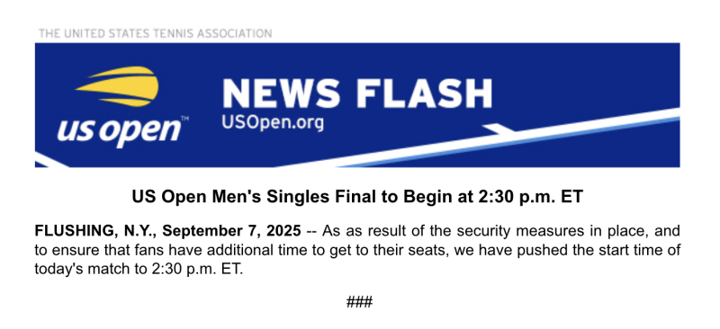 – All media members were required to exit Arthur Ashe Stadium by 11 p.m. on Saturday.