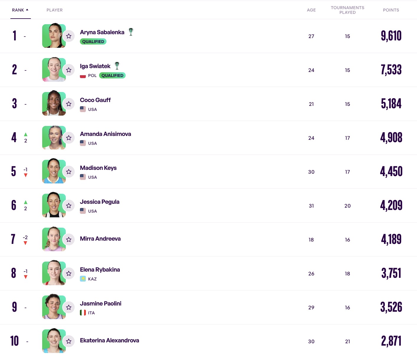 Zheng Qinwen (CHN): No. 7 ===========> No. 9 (Still out after elbow surgery, Zheng is still in the top 10 but that’s not likely to last until the end of the year. She was a quarterfinalist in New York a year ago, but has a LOT of points to defend before the end of the year: a semifinal at the 1000 in Beijing, a final at the WTA 1000 in Wuhan, a title at the WTA 500 in Tokyo, and a final at the WTA Finals in Riyadh. That’s nearly 60 per cent of her total and when they fall off, she would drop to about No. 30. That is still, actually, not that bad, considering. At the same time, it also gives you an idea of how many points she’d have to earn to get back to where she was).