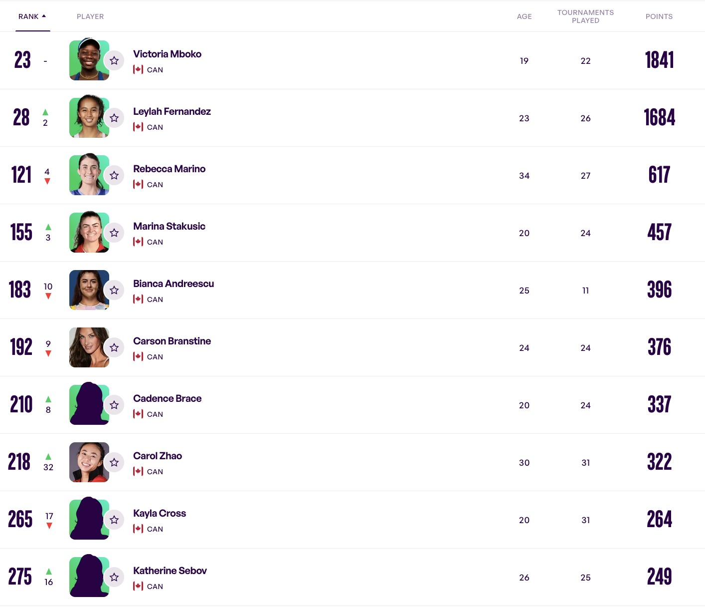 Carol Zhao (CAN): No. 250 ===========> No. 218 (Now 30, Zhao won a round at the US Open qualifying bowing out – and flying to Changsha, China to play a WTA 125 during the second week. At least her ranking got a nice little boost).