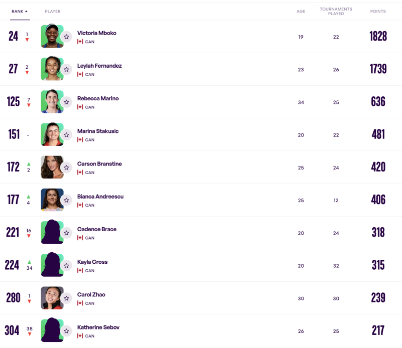 Kayla Cross (CAN): No. 258 ===========> No. 224 (Cross got high enough to get into Slam qualifying this summer, but dropped away. She takes a good step back with a run to the ITF final in Templeton, Calif).