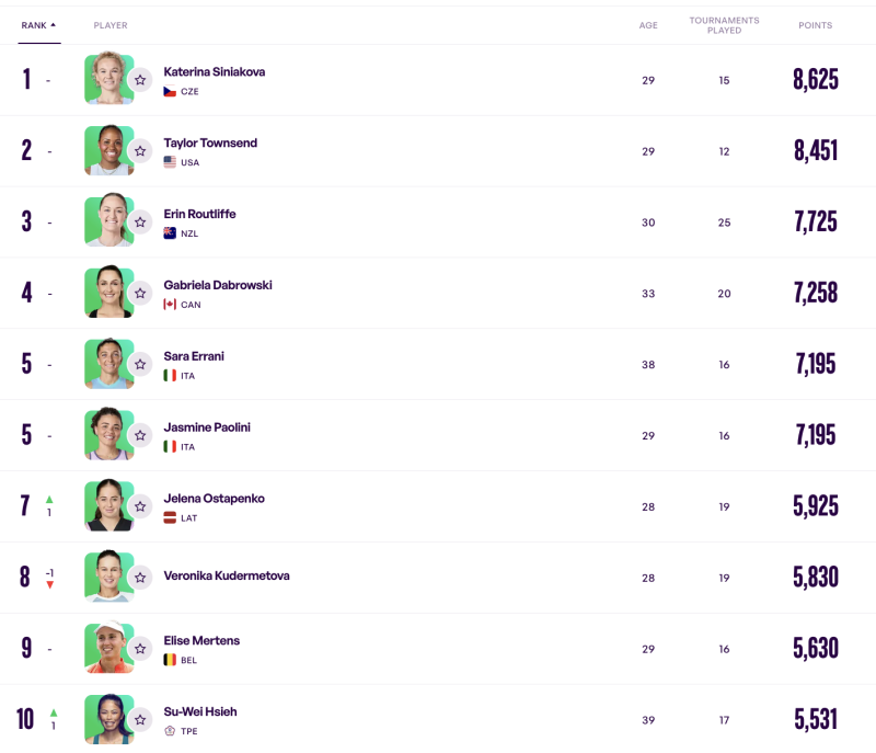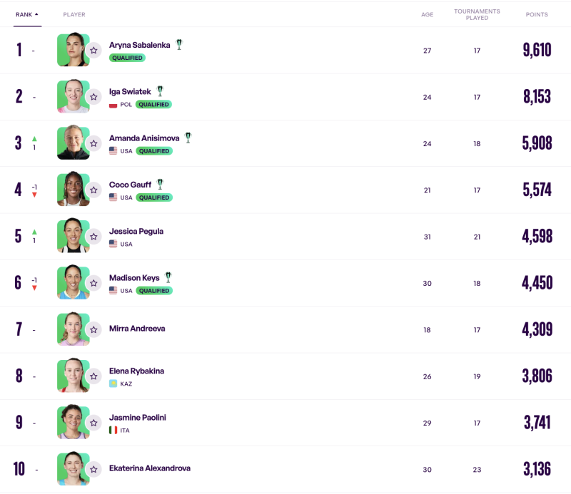 Zheng Qinwen (CHN): No. 9 ===========> No. 10 (Zheng is back, at least. She returned and won her first match in Beijing. But she withdrew from the next, and isn’t playing her hometown WTA 1000 in Wuhan. A lot of points going down for her – a Beijing semi last year, then a final in Wuhan, and then a title in Tokyo – and then the final at the WTA Finals, where she won’t qualify this year).(Not playing)