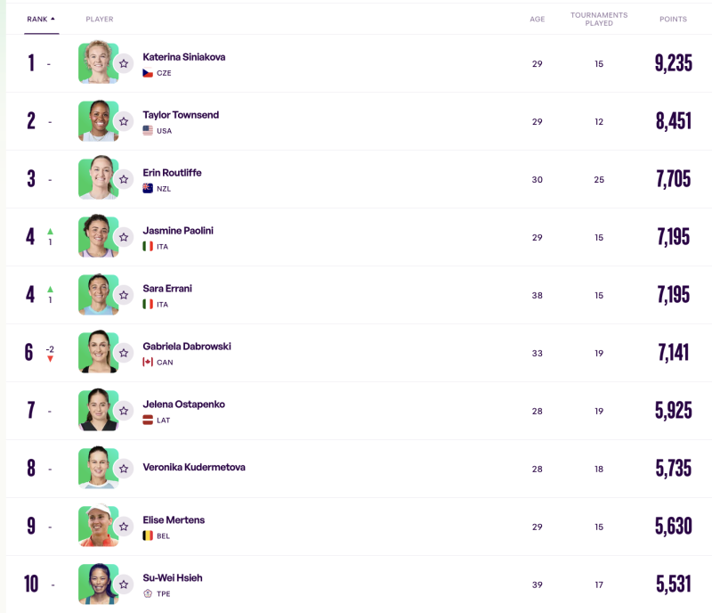 (Tsurenko has been out since last November, and drops the points from Wuhan a year ago. At 36, it’s unclear if she’ll be back.)