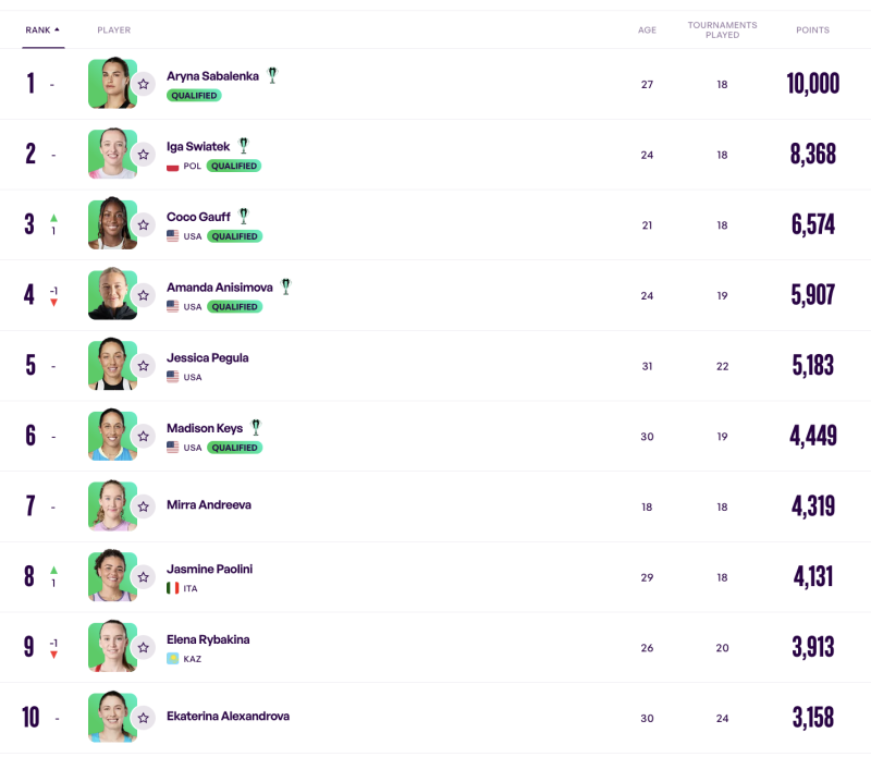 (Up a spot after Beijing, and another spot after Wuhan, the finalist didn’t quite have enough juice to overcome Coco Gauff, despite a positive head-to-head against her. But she qualifies for Riyadh, and all in all it’s been a positive season).