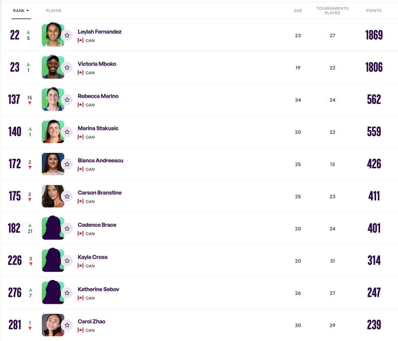 Leylah Fernandez (CAN): No. 27 ===========> No. 22 (Fernandez’s title in Osaka squeezes her past Victoria Mboko and installs her back in her longtime spot as the No. 1 Canadian. That was her fifth crown. Originally, she was to play Victoria Mboko in Tokyo but after Paolini’s withdrawal and moving the seeds around, she ends up against a qualifier. But that qualifier is Maria Sakkari).
