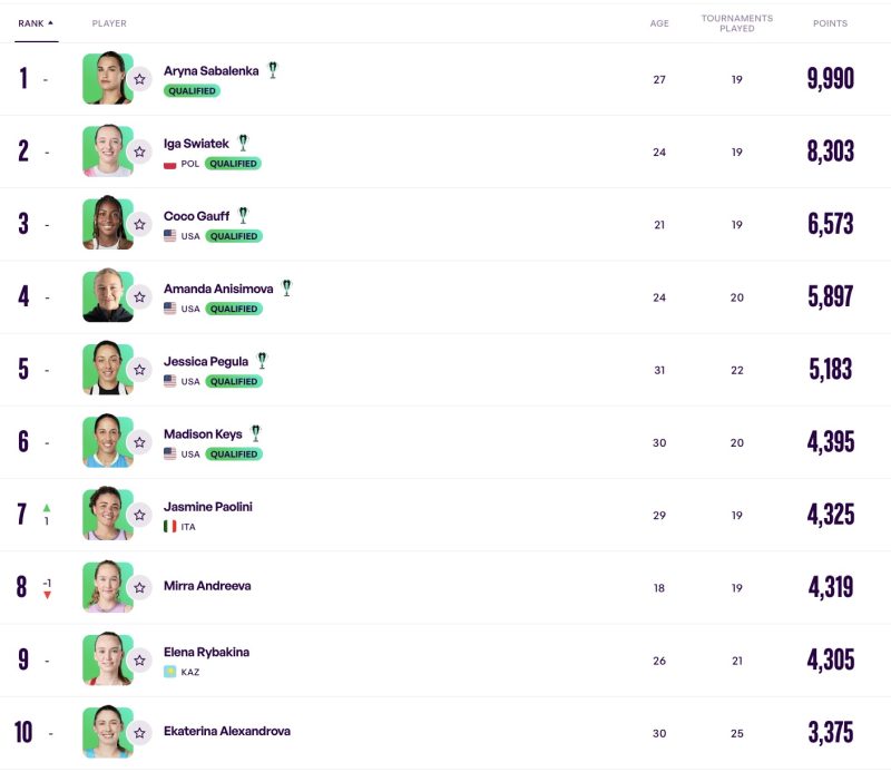 Mirra Andreeva (RUS): No. 6 ===========> No. 9 (Even as everything seemed so easy for 17-year-old Andreeva last year, when she won big titles and got to a career high of No. 5, so has it seemed arduous in recent months. There have been tears, and surprise losses. And with logistics precluding her taking a wild card into Tokyo this week – assuming she was up to making a run – she has to hope that Rybakina doesn’t do anything. Or that Madison Keys doesn’t come back after a long break to play in Riyadh. At any rate, the way it’s going, you wouldn’t think she’d do much in the Tour Finals beyond picking up some nice coin).