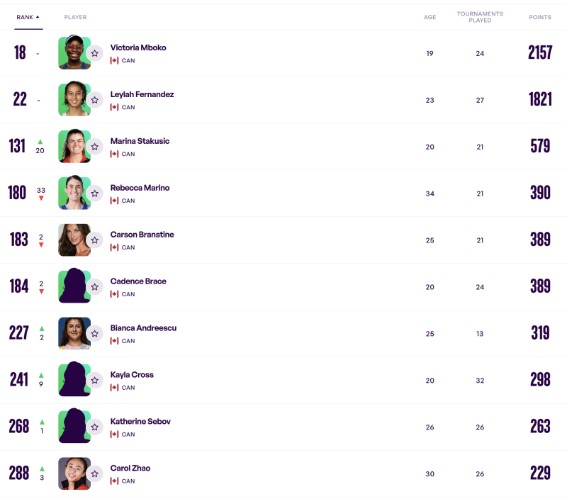 Marina Stakusic (CAN): No. 151 ===========> No. 131 (Stakusic’s sort-of sophomore season after making an impressive debut a year ago has been a struggle. But she’s finishing strong. Making the Austin 125 final means she’s almost back where she was at the start of 2025, after dropping as low as No. 168).