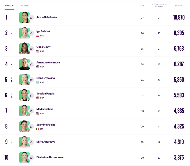 (Pegula had a good Finals, but drops a spot because of Rybakina’s 1,500-point haul).