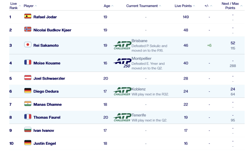 Rafael Jodar (ESP): No. 150 ========> No. 124 (The 19-year-old, who decided the NCAAs were done for him, qualified and won a round in Australia, losing to Jakub Mensik. That’s a career high).