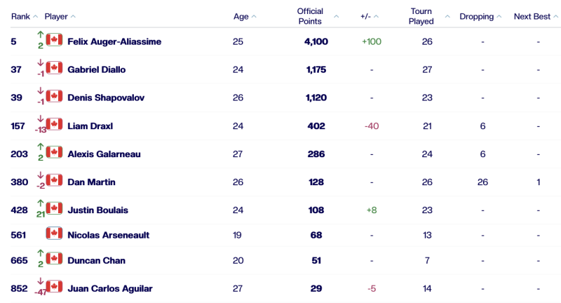 Felix Auger-Aliassime (CAN): No. 7 ============> No. 5