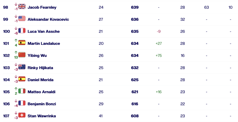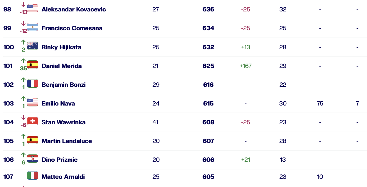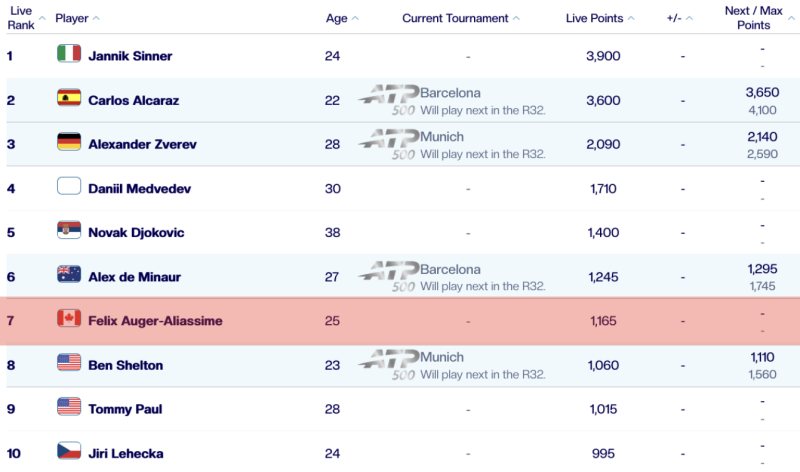 (Shelton didn’t play in Monte Carlo, one of many Americans to take a pass. But he moves up anyway after both Alex de Minaur and Lorenzo Musetti didn’t defend enough points in Monte Carlo and dropped down).