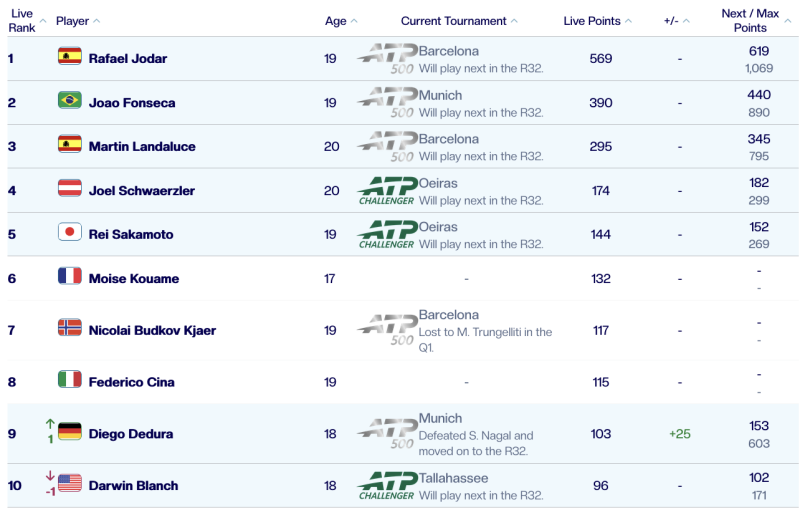(Davidovich Fokina slips out of the top 20 after dropping his points from the Monte Carlo semifinal last year. He’s obviously not healthy; he pulled out of Monte Carlo and is out again in Barcelona this week).